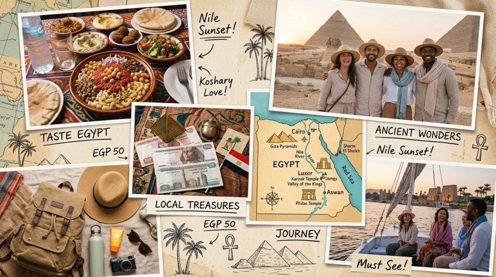 • Must-try dishes: Koshary (Egypt’s national dish), Ful Medames (fava beans), Molokhia (green soup), grilled kofta